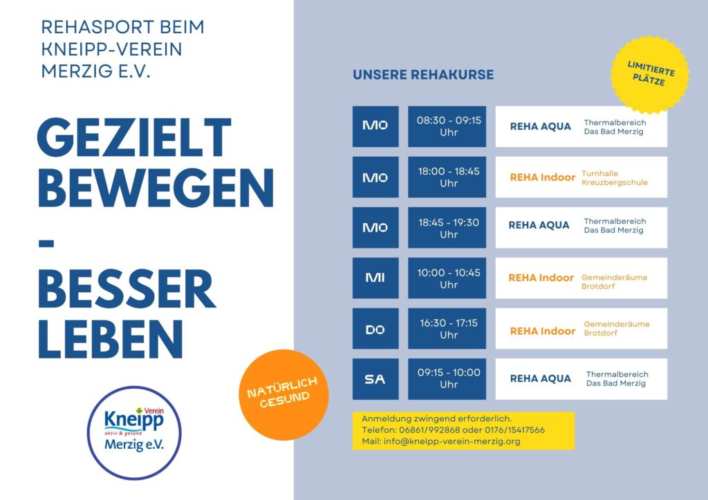 Vorm Eintritt in den Rehakurs kontaktieren Sie uns bitte unter der Telefonnummer 06861/992868, unter der Nummer 0176/15417566 oder per Mail unter info@kneipp-verein-merzig.org.